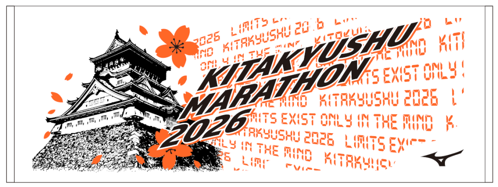 タオルデザインを大公開! メダル裏面の【桜舞う小倉城】とTシャツ前面の【7セグメントフォント】で時間的な立体感を表現しています。 タオルを掲げてTシャツ&完走メダルとともに完走記念撮影をしましょう!