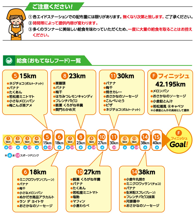 ランナーの皆さんにエネルギーを補給していただくため、スタート会場、コース上6箇所のエイドステーション、フィニッシュ会場で、給食(おもてなしフード)を提供します。
